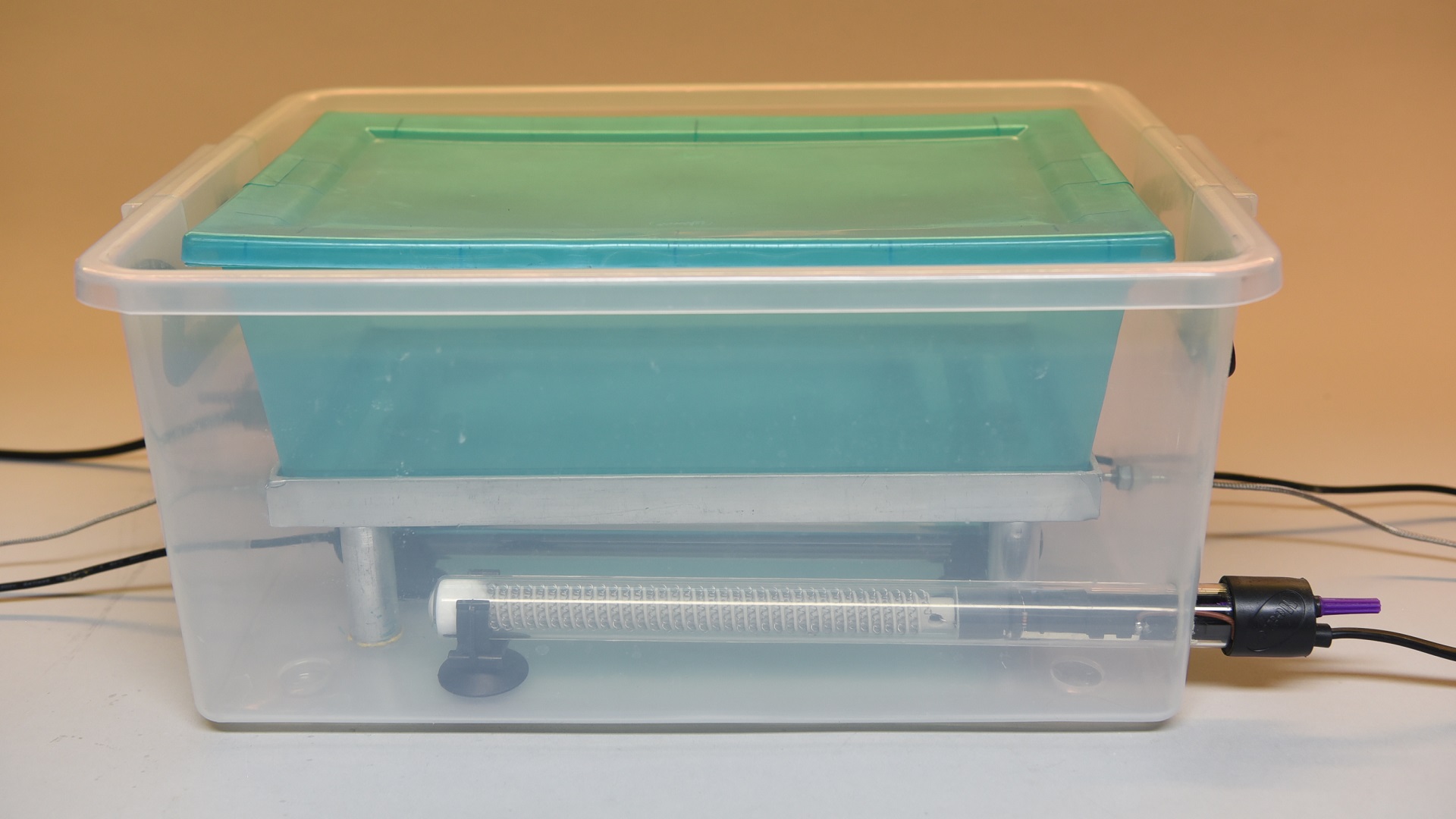 Como medio calefactor utilizamos dos calentadores para acuarios y prescindimos del termostato de serie que incluyen para poder llegar a temperaturas más altas (50–60 °C); cada uno es controlado por un triac, mientras que el control de fase PWM con cruce por cero maneja sin problemas los 500 watts de potencia que entrega cada calentador.