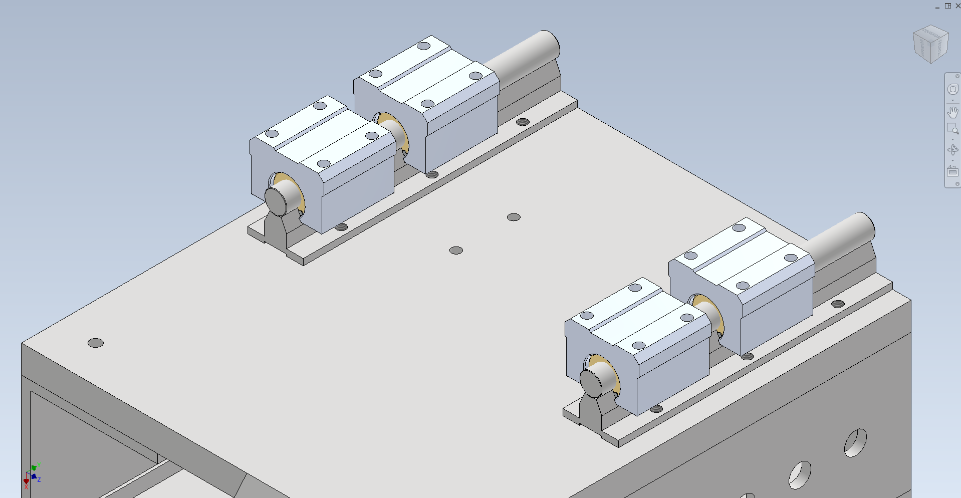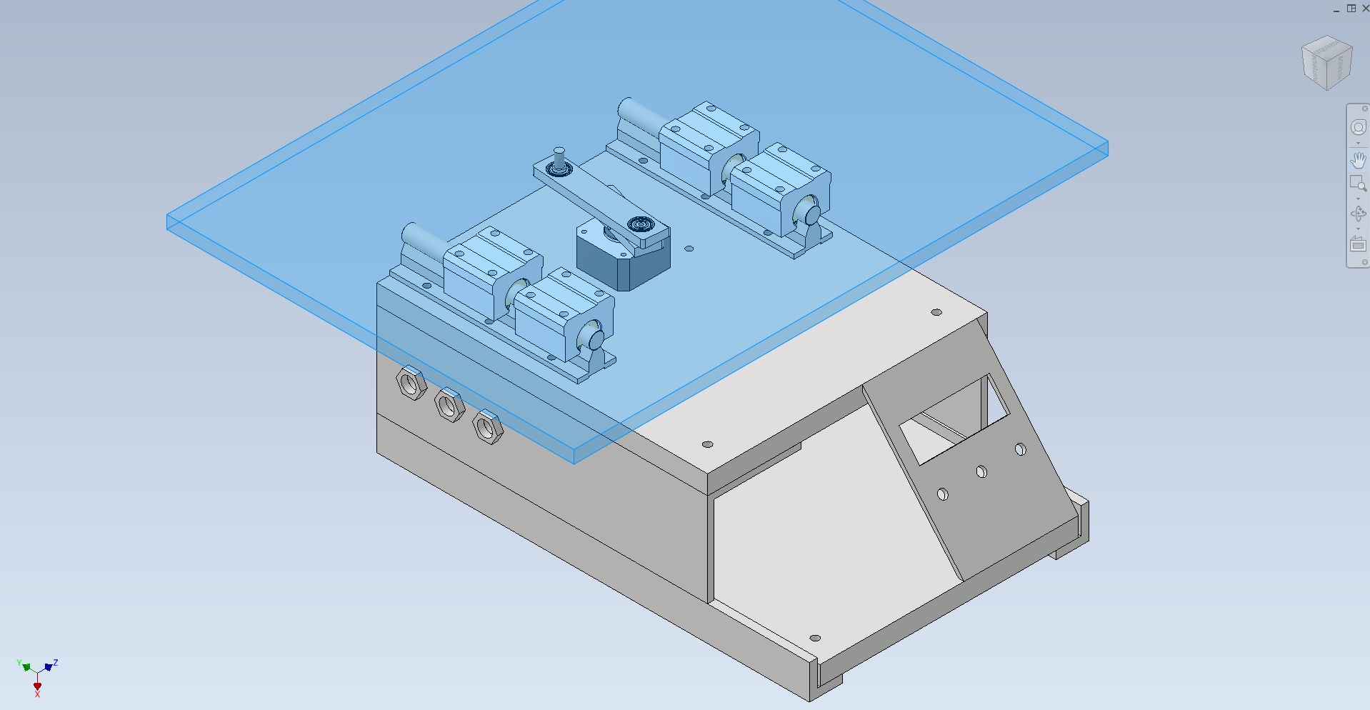 Un conjunto de dos guías lineales y cuatro rodamientos abiertos, montados sobre una base de aluminio, forman el émbolo, que es la parte que se desplaza en línea recta.