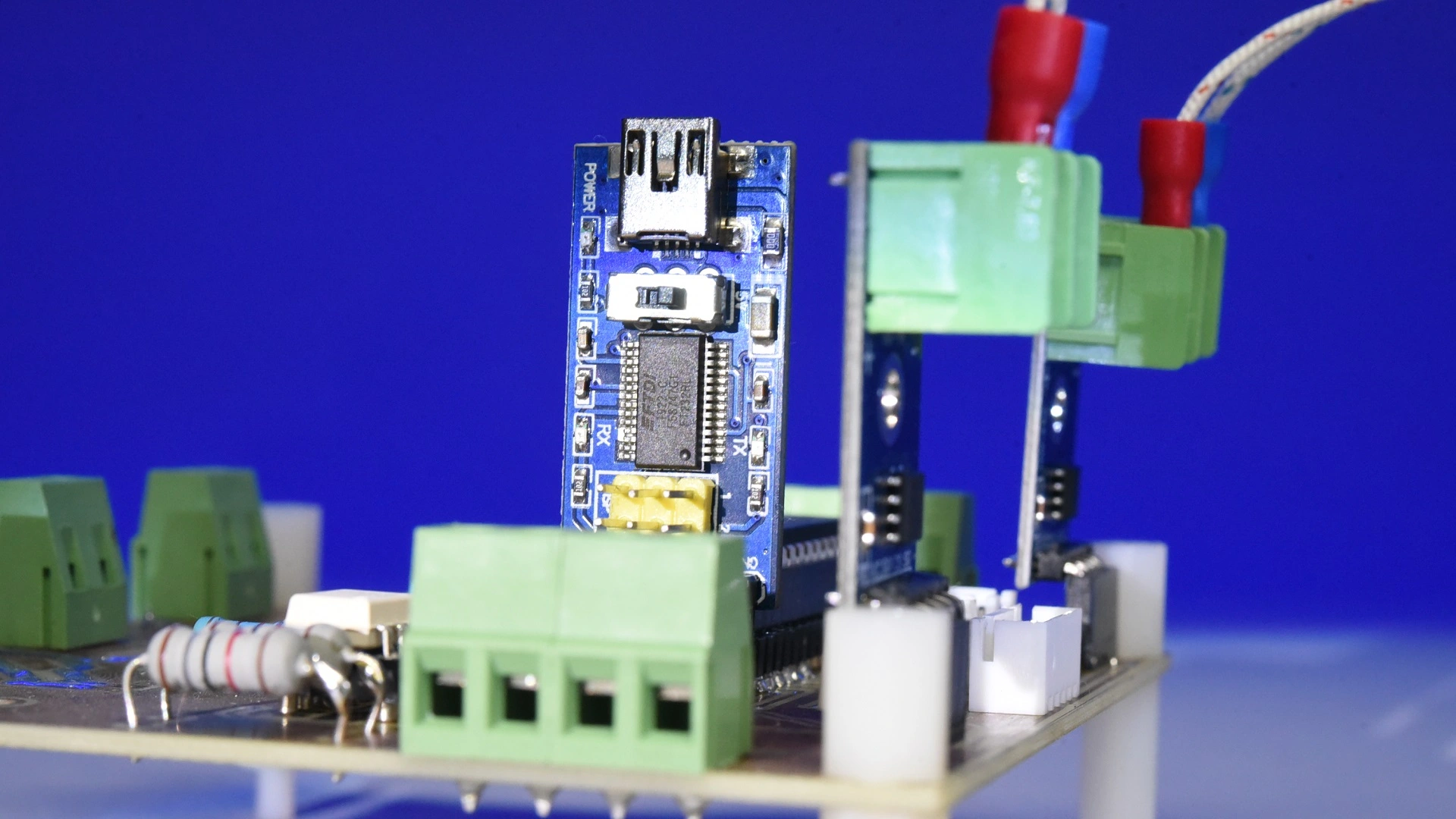 La comunicación USB con la PC se resuelve con un convertidor USB-232 basado en el popular chip FTDI232RL.