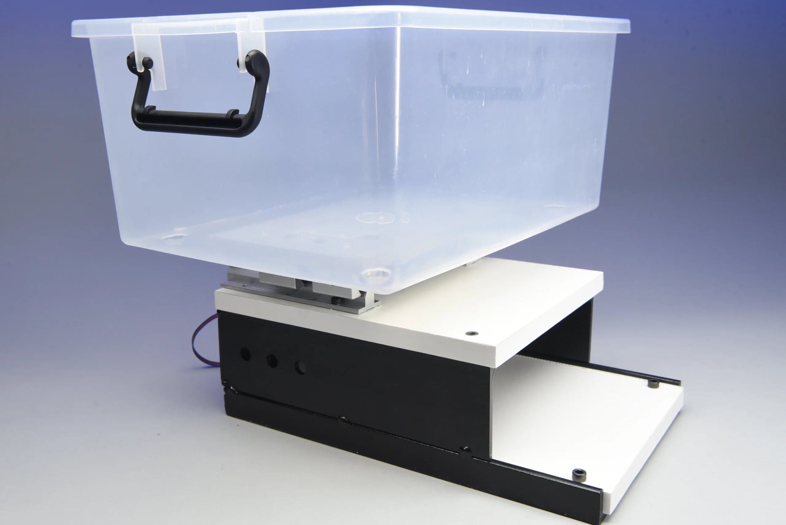 Un motor a pasos acoplado a un sistema mecánico de biela-manivela transforma los giros del motor en un movimiento lineal. Las guías con rodamientos lineales abiertos producen un desplazamiento suave, justo para crear “olas” controladas en la disolución química.